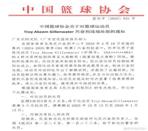 在国家体育总局反兴奋剂中心于2025年4月16日实施的赛内兴奋剂检查中,你单位男子篮球运动员吉伦沃特的A样本尿样检测结果呈大麻酚类(羧基四氢大麻酚)阳性。