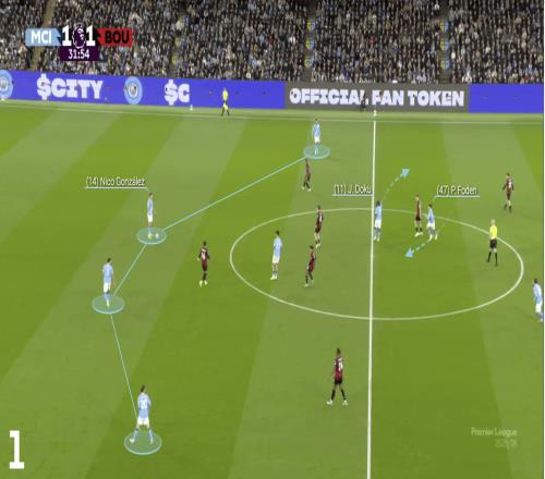 在第二个画面中,尼科-冈萨雷斯将球传给福登,福登与多库轮转进入一个空当,谢尔基也意识到需要回撤,接到福登的一脚传球,福登的移动吸引了中后卫塞内西进入中场。