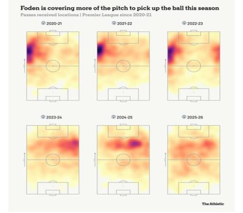 但英超的教练们现在更愿意对曼城进行压迫,这意味着福登所擅长的拥挤区域出现在离球门越来越远的地方。