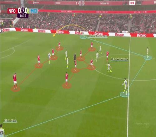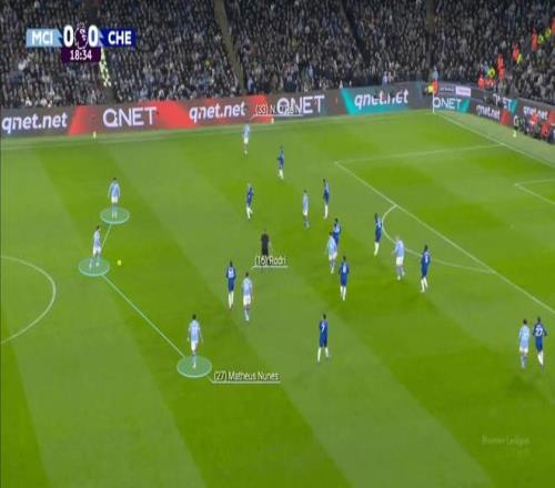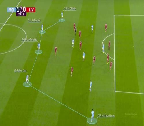 努内斯被安排在另一侧,曼城开始将边后卫用作解围路线,拉开对手的防线,并进攻任何出现的空当。