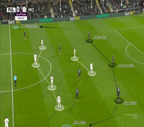 例如,在对阵富勒姆时,尼科-冈萨雷斯回撤组成三后卫阵型,让中后卫分开,而边后卫则向前推进。