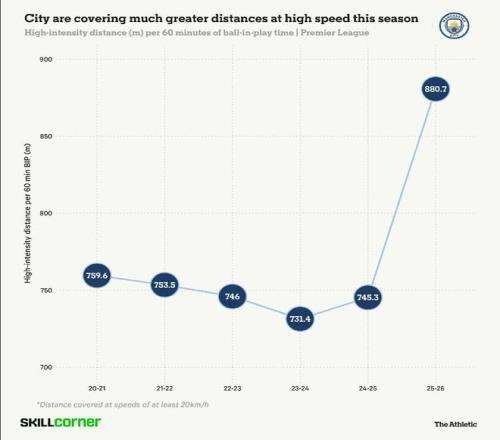 根据SkillCorner的追踪数据,曼城每60分钟的高强度跑动距离(以20公里/小时或更高速度跑动)增加了约18.2%,这给核心球员群体带来了额外的体能负担。